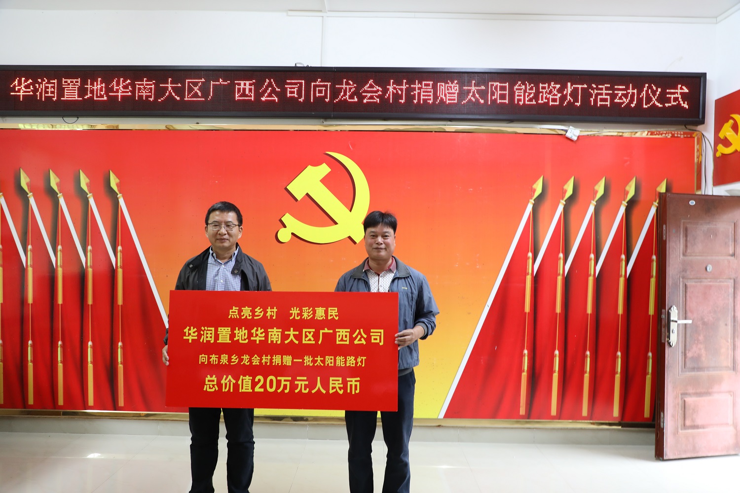10月14日,南寧市自然資源局?jǐn)y愛(ài)心企業(yè)華潤(rùn)置地華南大區(qū)廣西公司到我院結(jié)對(duì)幫扶貧困村布泉鄉(xiāng)龍會(huì)村開(kāi)展扶貧捐贈(zèng)活動(dòng),向龍會(huì)村捐贈(zèng)一批價(jià)值20萬(wàn)元的太陽(yáng)能路燈,助力鄉(xiāng)村振興。
