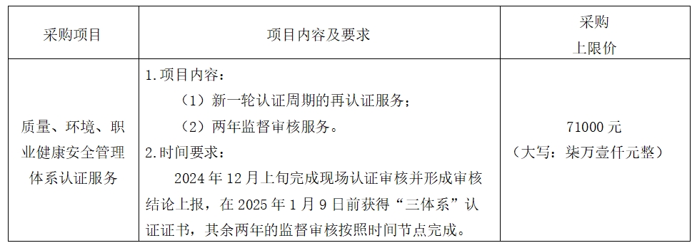 2024年12月上旬完成現(xiàn)場認證審核并形成審核結(jié)論上報,在2025年1月9日前獲得“三體系”認證證書,其余兩年的監(jiān)督審核按照時間節(jié)點完成。服務(wù)期限內(nèi),如中標(biāo)人未能按照合同條款約定履行合同義務(wù),采購人有權(quán)提前終止合同(具體以簽訂合同為準(zhǔn))。